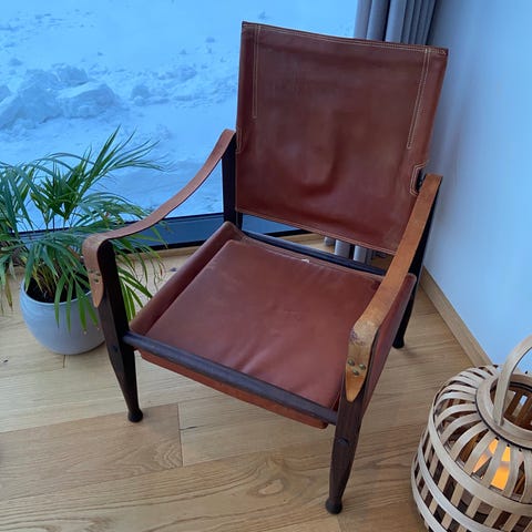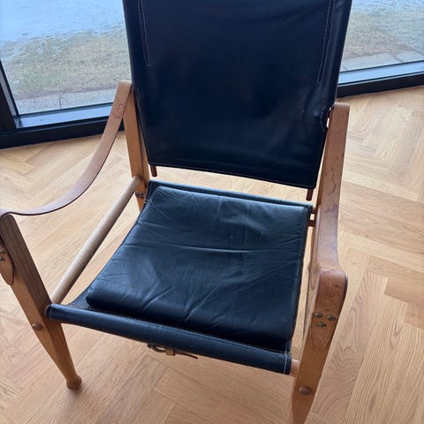 Kaare Klint ‘Safaristol’ med stel af mørkbejdset asketræ og armlæn af naturlæder. Stolen er betrukket med flaskegrønt kanvasstof. Stolen fremstår med patineret stof og læder.