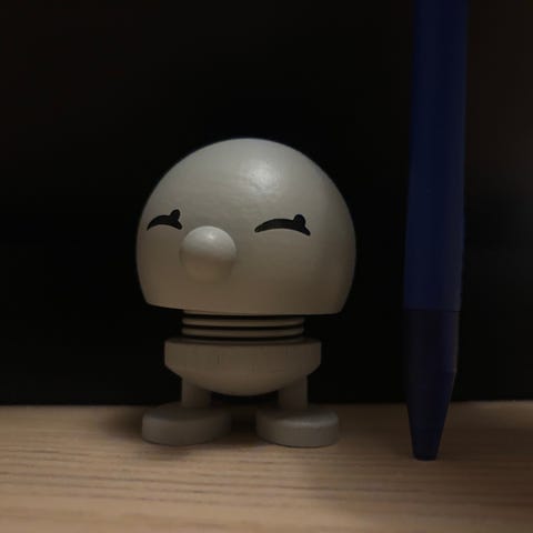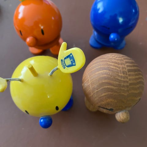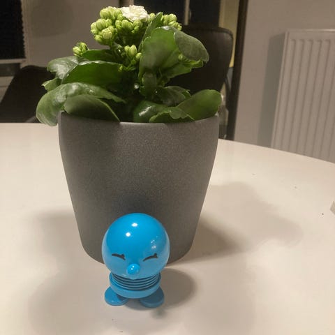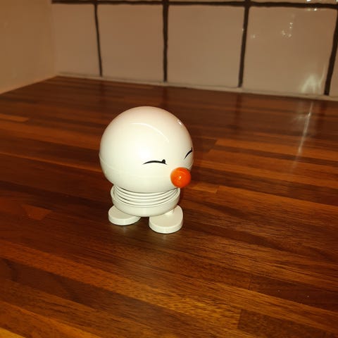 Klassisk blå/turkis Bumble Hoptimist. Figuren er i fin stand og hopper perfekt på fjederen. Den måler ca. 8,5 cm i højden (str. Small), hvilket gør den ideel til at stå på en hylde, et skrivebord eller i en vindueskarm.
