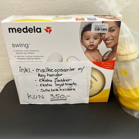 Medela elektrisk brystpumpe med tilhørende flasker, låg og pumpehoveder. Sættet omfatter den elektriske pumpeenhed med strømforsyning, flere brystpumpedele, slanger samt opbevaringsflasker med skruelåg. Egnet til udpumpning og opbevaring af modermælk. Alle dele er i plastmateriale og passer sammen som et komplet Medela-pumpesystem.