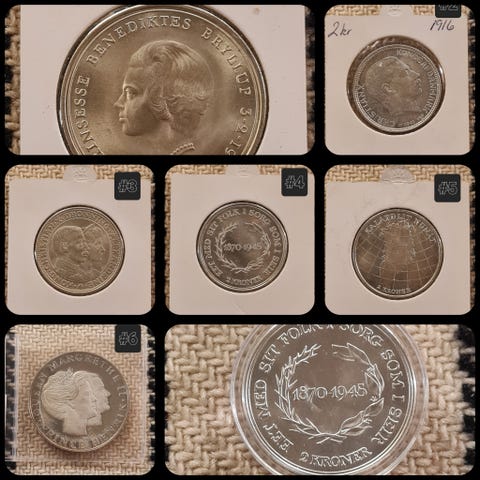 Indeholder 11 danske 2kroner i sølv / 1 5krone i sølv / 3 10kroner i sølv.