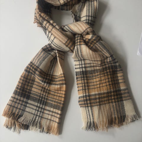 Ternet blazer med spidsrevers. Farver: beige bund med sort, grå og rosa linjer, der danner ternet mønster, se fotos.