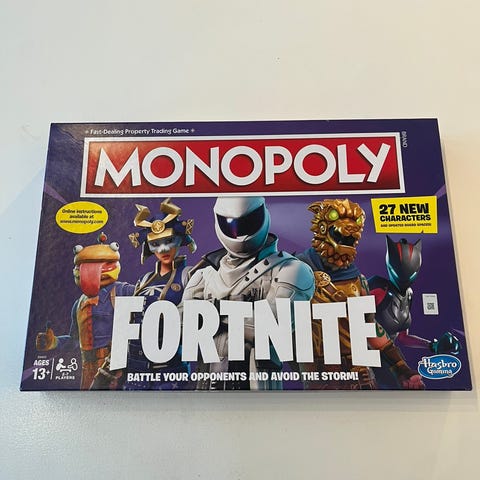 Hasbro Monopoly Fortnite brætspil. Udgave af Monopoly baseret på Fortnite-universet. For 2-7 spillere og anbefalet fra 13 år og opefter. Spillet indeholder spilleplade, figurer, kort og tilbehør til at spille en Fortnite-inspireret version af det klassiske Monopoly-spil.