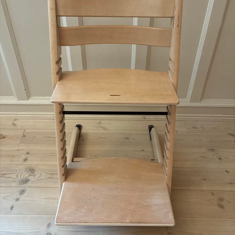 Klassisk model med justerbar siddeplade og fodplade, så stolen kan tilpasses barnets højde. Bøjle og pude medfølger