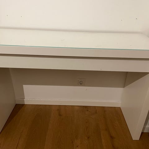 To stk. skriveborde fra Ikea med hvid matteret glasbordplade og aluminium ben, som kan indstilles i højden på hvert ben.