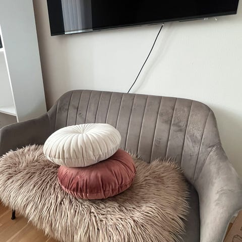 Bænk med ryglæn og sædehynde i lys tekstil.