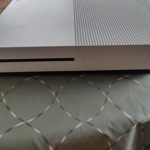 Xbox One S konsol med fodstander så den også kan stå vertikalt og der medfølger også grip for controller samt grip for analog sticks for bedre styring. Alting er iorden og virker som ny, konsollen er formateret og klar til ny ejer!