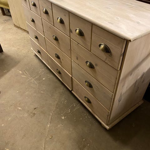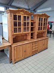 Møblet har en robust konstruktion i lyst træ med en glat overflade. Det indeholder flere skuffer og skabe til opbevaring. Træet har synlige åretegninger, hvilket giver et naturligt udseende. Metalhåndtagene tilføjer et moderne touch. Behandlingen fremhæver træets varme nuancer.