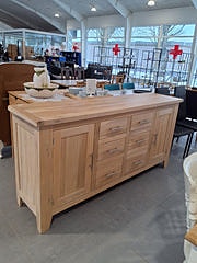 Møblet er lavet af lyst træ med en naturlig finish, har glasdøre og flere opbevaringsrum.