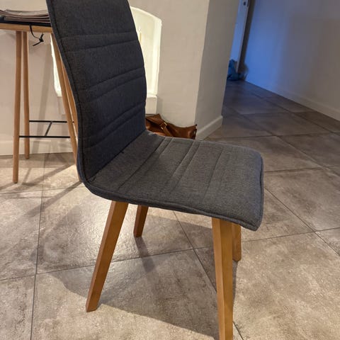 Jysk stol i gråt stof med polstret sæde og ryglæn. Stolen har slanke ben i trælook med sorte foddupper. Egnet som ekstra stol i stue, soveværelse eller skrivebordsstol. Neutralt design, der passer ind i mange boligindretninger.
