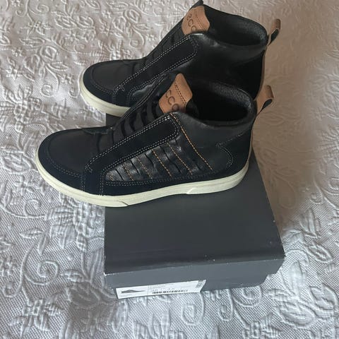 Ecco unisex støvler i str. 40. Støvlerne er sorte og har velcrolukning foran. Overdelen er i tekstil og syntetisk materiale med polstret skaft for komfort. Indvendigt mærke viser størrelse 40 EU / 6,5-7 US / 6,5-7 UK. Velegnet som unisex børne- eller juniorsko til hverdag og udendørs brug.
