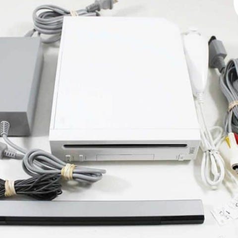 Nintendo Wii konsol i hvid. Sættet omfatter selve Wii-konsollen, strømforsyning, AV-kabel til tilslutning til tv, sensorbar samt en Wii Remote og Nunchuk-controller. Spillet Wii Fit på disk medfølger ifølge billederne. Konsollen er egnet til brug med kompatible Wii-spil og -tilbehør, og kan tilsluttes ældre fjernsyn via det medfølgende AV-kabel. Serienummer og modeloplysninger fremgår af mærkaten på undersiden af enheden.