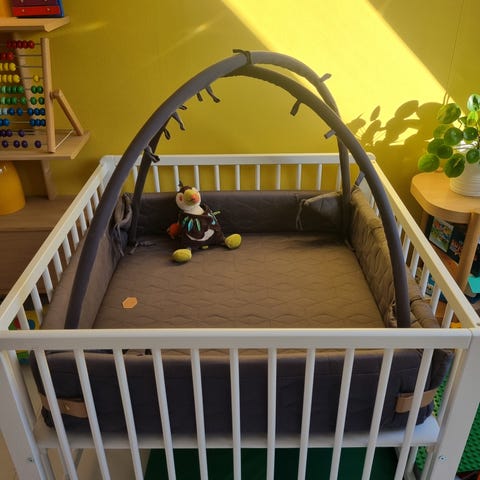 Koksgrå kravlegård/legetæppe fra Filibabba. Kan slås ud ig blive ét stort tæppe uden kanter. Aftagelige bøjler. God stand, fra dyre- og røgfrit hjem.