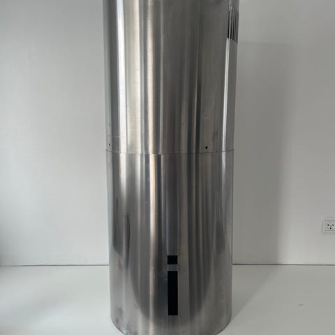 Emhætte i vægmodel udført i rustfrit stål med buet glasplade over kogepladen. Skorstenen er forlænget så den kan nå kip.