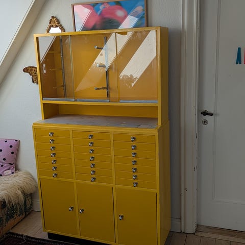 Skabet er tungt, så hvis du ikke selv lider at kæmpe muskler, så tag gerne et par stærke venner med. Det står i stueplan.