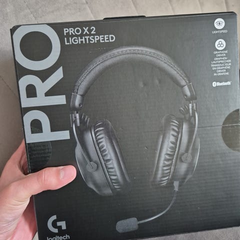 Logitech Pro X trådløst headset i sort. Over-ear gaming-headset med polstret hovedbøjle og udskiftelige ørepuder. Headsettet har trådløs forbindelse via USB-dongle samt mulighed for kablet tilslutning. På ørekoppen ses knapper til lydstyrke og tænd/sluk samt opladningsport. Aftagelig mikrofon medfølger sammen med ekstra ørepuder og kabel, som på billederne. Velegnet til brug med pc og andre enheder, der understøtter USB- eller jack-tilslutning via det medfølgende udstyr.