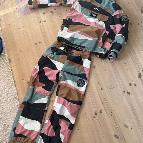 Dope skisæt bestående af jakke og bukser i størrelse XS. Jakken er i gråmeleret farve med hætte, lynlås og flere frontlommer samt justerbare manchetter. Bukserne er sorte med flere lommer, bæltestropper og snøre i taljen. Sættet er designet som yderbeklædning til ski og snowboard med fokus på bevægelsesfrihed og praktiske detaljer som rummelige lommer og justeringsmuligheder.