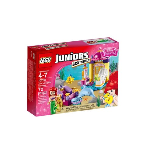Træd ind i den magiske LEGO® Juniors Disney Princess™ verden med Ariels delfintrukne karet, undervandsslot med stol, spejl, muslingeskalformet sæde og skuffe, der kan åbne og lukke samt masser af tilbehør. LEGO Juniors giver en alderssvarende byggeoplevelse for børn i alderen 4-7 år med simple modeller af Disneys elskede og klassiske historie om havfruen Ariel. Minidukkefigur af Ariel samt figurer af hendes bedste ven Tumle og en delfin medfølger.