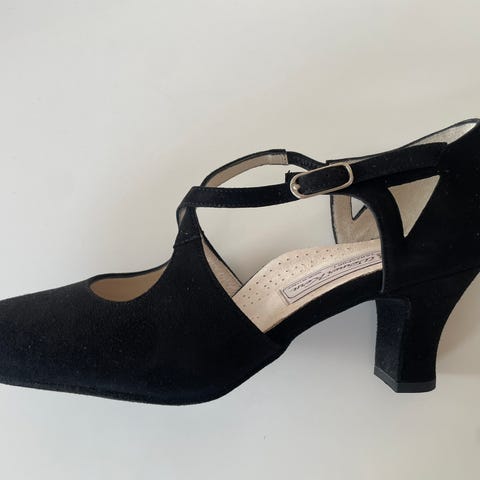 Helt nye, aldrig brugte tangosko, størrelse 5 , hvilket svarer til størrelse 38, hælhøjde 4,5, sort ruskind.