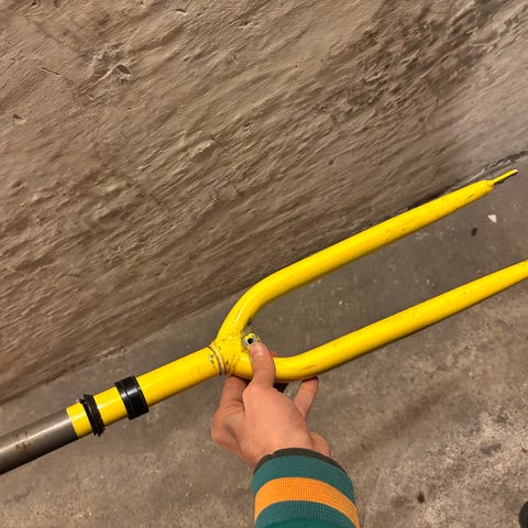 Cykelgaffel i sort stål. Klassisk, lige forgaffel med gevindstyr og hul til montering af forhjul. Egnet som reservedel eller til ombygning af cykel, hvor der ønskes en enkel, robust stålgaffel. Mål på styr- og kronrør fremgår af billederne med målebånd og skydelære, så kompatibilitet kan kontrolleres i forhold til eksisterende stel og lejer.