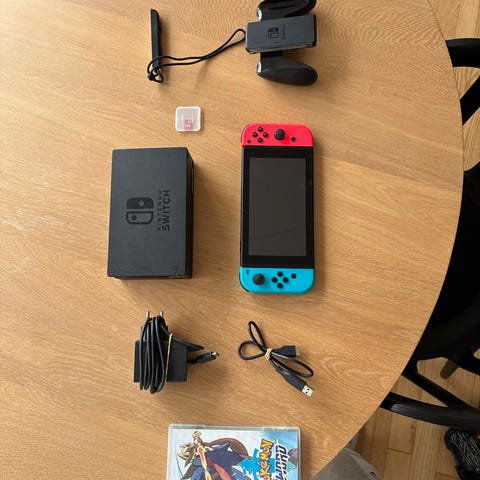 Nintendo Switch konsol med neon rød og blå Joy-Con controllere. Konsollen kan bruges både som håndholdt enhed og tilsluttes tv via den medfølgende dock. På billederne ses original emballage samt spil, som eventuelt kan følge med afhængigt af sælgers oplysninger. Velegnet til singleplayer og multiplayer spil hjemme eller på farten.