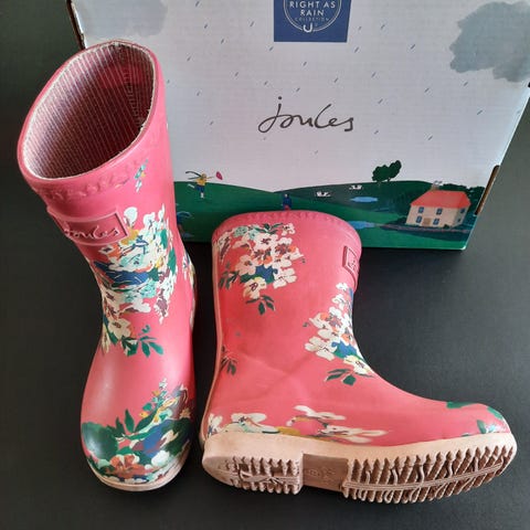 Wheat børne gummistøvler i størrelse 26 designet til piger. Støvlerne er fremstillet i gummi med et mønstret design og har en skridsikker sål. Velegnede til vådt vejr og udendørs brug.