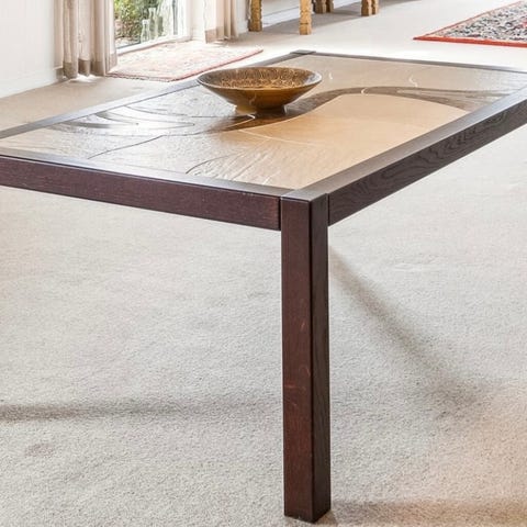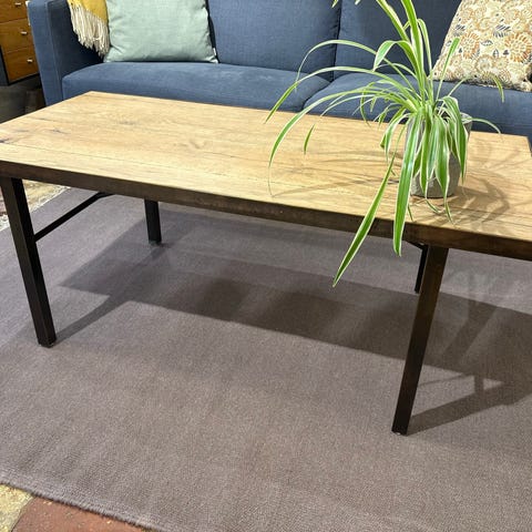 Sofabord med patineret massiv egetræsplade og hvidmalede ben. Mål.: længde 135 cm, bredde 75 cm, højde 48 cm.