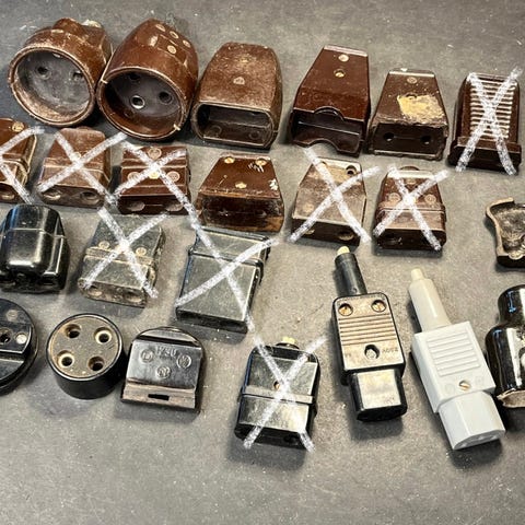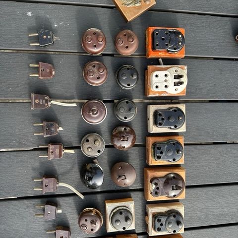 Brun bakelit, gammel elektrisk stik, bakelit stikkontakt , stikdåse i bakelit ( kender ikke de rigtige navne), bakelit dobbeltstik - der er 6 stk + en halv, gammelt brun bakelit se & hent i Esbjerg Midtby, sælges samlet til prisen, sendes gerne ..