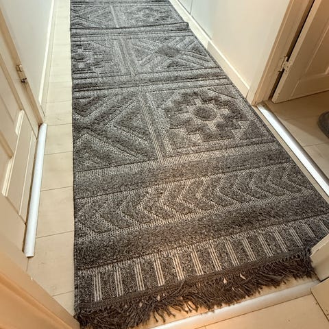 Det lille tæppe måler 120 x 237 cm., og er til at bruge under sofabordet i stuen. Standen er rigtig god her.