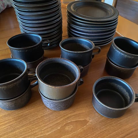 Arabia RUSKA stentøj stel i brun glasur. Sættet omfatter tekande samt 4 frokosttallerkener dia 20 cm og 4 the kopper. Alle dele er udført i kraftigt stentøj med mat-brun, let spættet overflade.