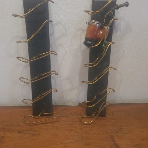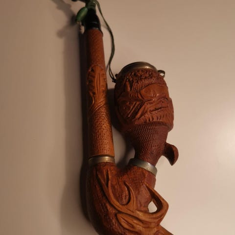 Vægophæng til piber i træ med broderet front. Ophænget har flere kroge til opbevaring og præsentation af piber eller lignende genstande. Forsiden er dekoreret med et blomstermotiv i broderi, og rammen er udført i træ. Størrelsen er ca. 65 x 27 cm, egnet til montering på væg i f.eks. stue, kontor eller samlerrum.