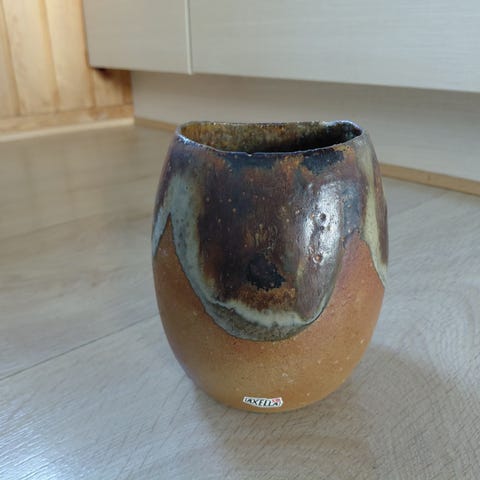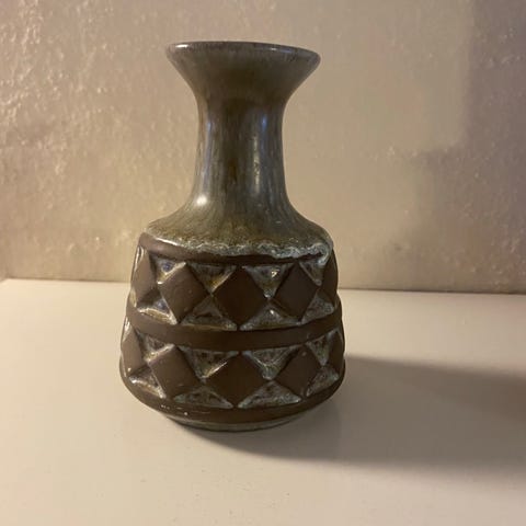 Keramikvase. Strehla Keramik 9022 ? Højde ca. 10 cm. Diameter hul ca. 2,8 cm. Bredden på det bredeste sted ca. 10 cm. Giv et bud.
