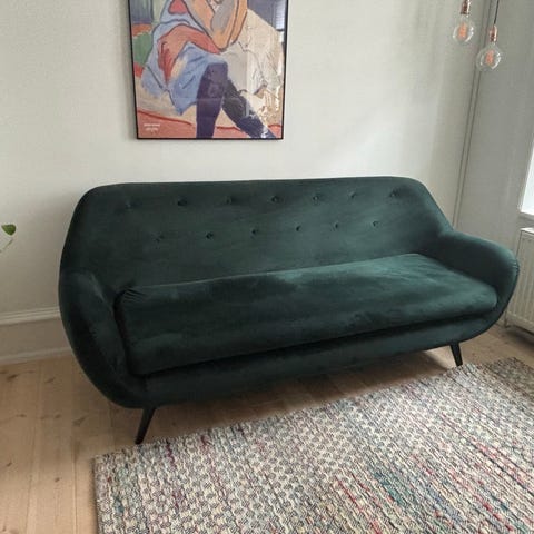 Moderne sofa i en dyb blå velour med sorte ben, som fuldender det stilrene look. En fin lille og dekorativ sofa, som du både kan slænge dig i og pynte med fine puder, så den ligner en million.