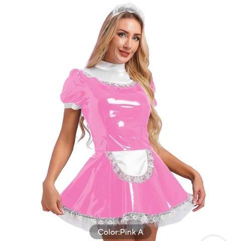 stuepige kostume kjole i sort til unisex. Kort kjole med pufærmer, hvid krave og hvidt forklæde foran. Nederdelen er vid med blondekant langs kant og forklæde. XL