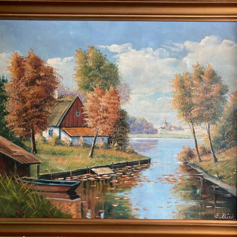 E. Birk ældre maleri med Himmelbjerget i baggrunden. Maleriet måler 78x58 cm og er udført på lærred monteret i en profileret træramme i natur- eller gyldenbrun tone. Signatur "E. Birk" ses nederst i billedet.