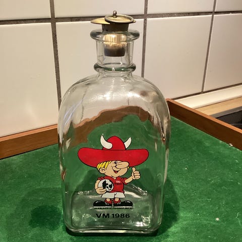 Holmegaard glasflaske/karaffel med trykt motiv i guld af oldtimerbil og tekst relateret til Motorbranchens Arbejdsgiverforening. Flasken er udført i klart glas med påsat Holmegaard-mærkat. Velegnet som dekorativ flaske eller samlerobjekt inden for glas og automobilrelaterede effekter.