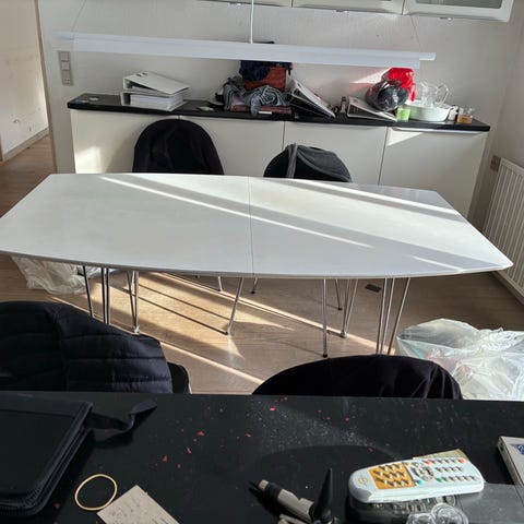Fint spise bord med tillægsplader så det kan blive 220 langt. 90 cm bredt.