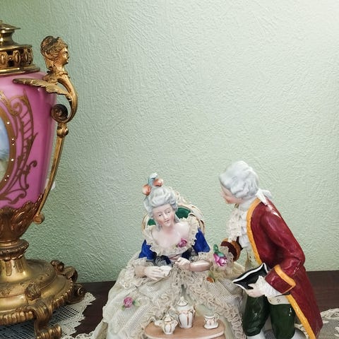 Porcelænsfigur med motiv af et stående par i historiske dragter. Figuren er flerfarvet med blandt andet blå og lysegule nuancer og står på en oval fod.