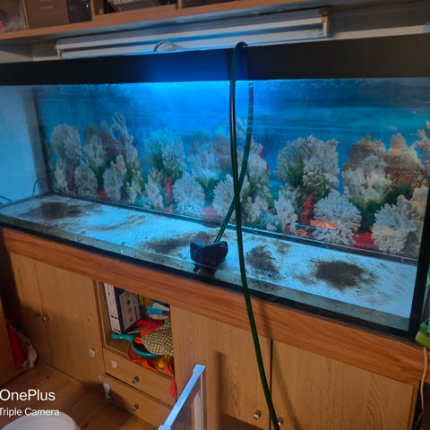 Sælger dette 530 liters med alt indhold af fisk, en stor rod, led lys og baggrund.