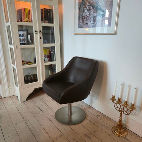 Smuk stol med betræk i sort læder og med ben i eg. God siddekomfort, benyttet som kontorstol. Brugt med fin patina, nypris 5.400,-. Afhentes på Platanvej, Frederiksberg C.