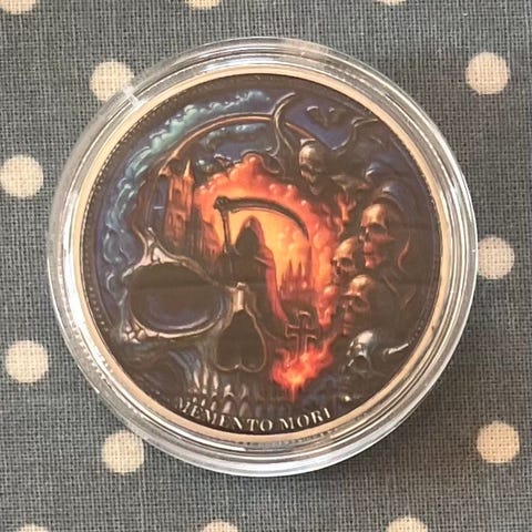Flot memento mori (husk at du skal dø) medalje Ø 40mm i kapsel