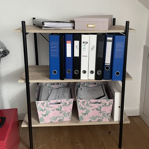 Reolen er udført i lyst trælook og har to åbne hylder samt en nederste skuffe med hængemapper, egnet til opbevaring af dokumenter eller andre mindre genstande. Velegnet som opbevaringsmøbel på kontor, værelse eller stue.