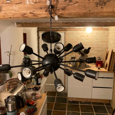 Lysekrone fra Markslöjd i blankt stål med matte glasskærme. Lampen er med kronetænding hvor alle lamper kan være tændt eller 2 henh. 3 af gangen. Ca.60 cm i diameter og ca.50cm høj. Kun afhentning