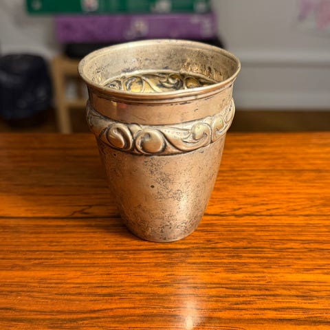 Ukendt mærke lille sølvfarvet metalbæger hamret overflade ca. 7 cm