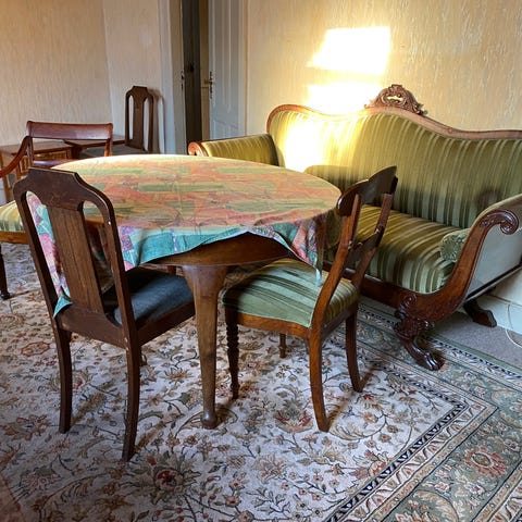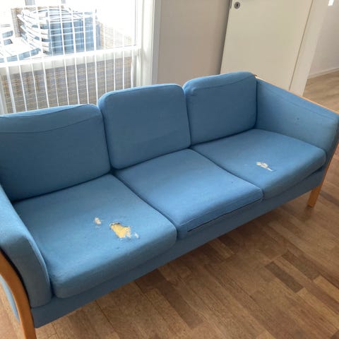 Bøg med sort læder. Masser af patina, og stadig god siddekomfort. Hynder med nyere skum