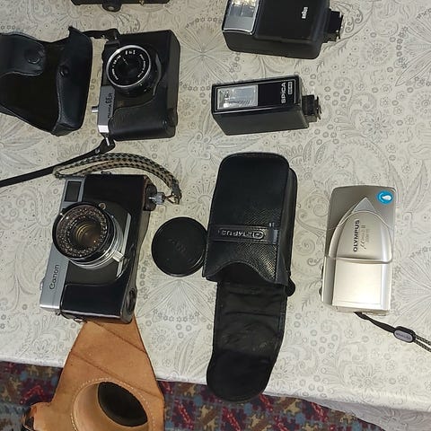 10 analog kamera til 120 og 24/36 film. Stand: Tænker de virker, men ingen garanti. Sælges samlet for 1000,- kan sendes.