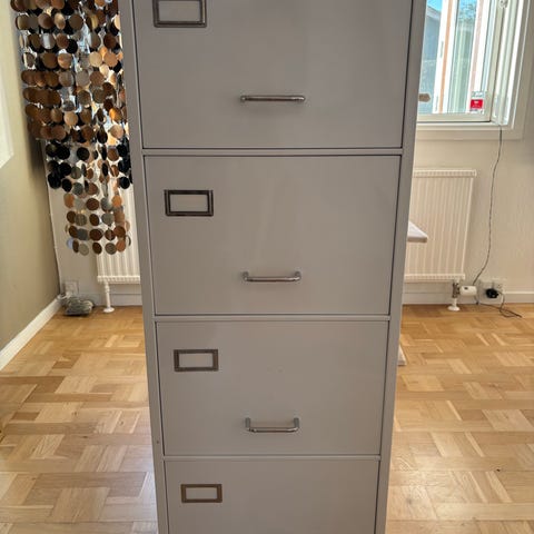 Arkivskab i metal med flere skuffer i hvid farve. Skabet har udtræksskuffer med håndtag og etiketholdere på fronten, samt lås øverst. Velegnet til opbevaring af dokumenter og mapper på kontor eller i hjemmet.