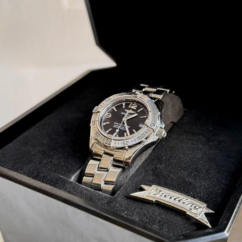 Breitling dameur med rund stålkasse og stållænke. Uret har mørk skive med markeringer og datovisning. Bagsiden er skruet og mærket med Breitling graveringer. Leveres med original æske i bakelit, som vist på billederne. Velegnet som armbåndsur til kvinde.