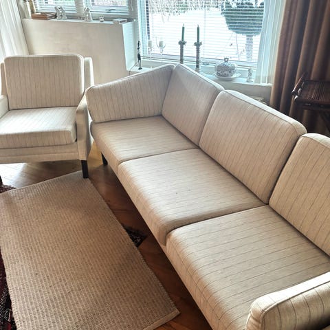 Stofsofa og matchende lænestol i lys grå farve. Begge møbler har polstret sæde og ryglæn med faste hynder. Sofaen har tre siddepladser, og lænestolen har brede armlæn for ekstra komfort. Benene er i træ med naturfinish. Velegnet til stue eller opholdsrum, hvor der ønskes et enkelt og neutralt udtryk i indretningen.