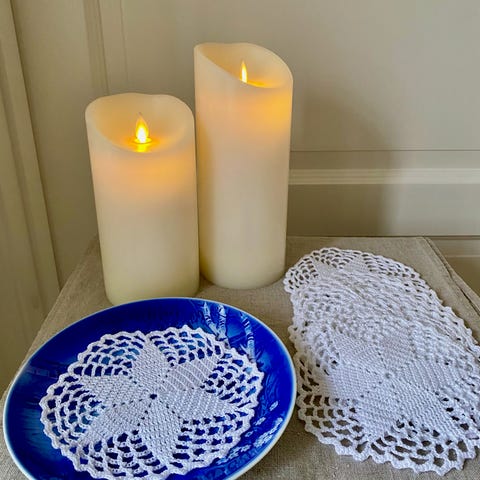 Jeg har godtnok hæklet mange af de her flakon'er. De her 4 måler ca 17 cm i diameter. Samlet 60 kr.
