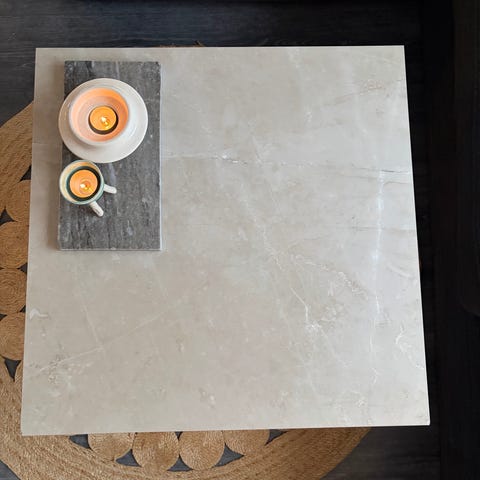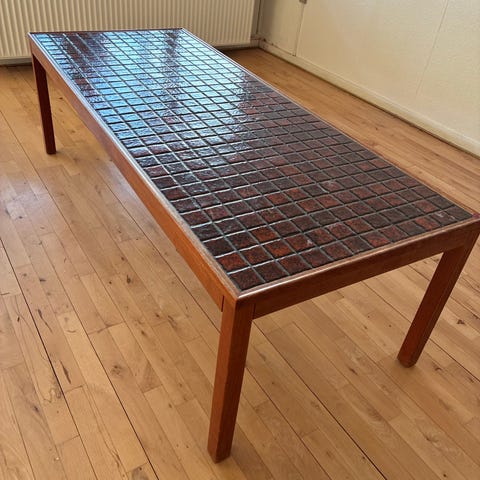 Sofabord med bordplade i keramiske fliser i brune nuancer med dekoreret mønster. Bordet har rektangulær form og træramme omkring fliserne. Egnet som stuebord eller sofabord til opbevaring af fx pynt, drikkevarer og mindre genstande på overfladen.